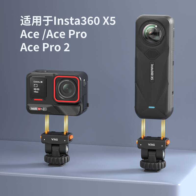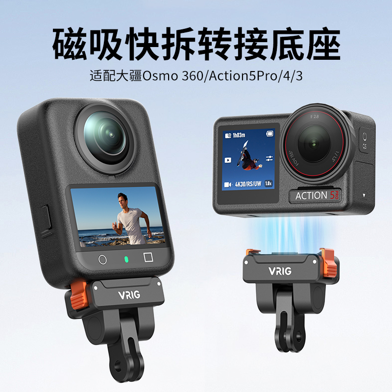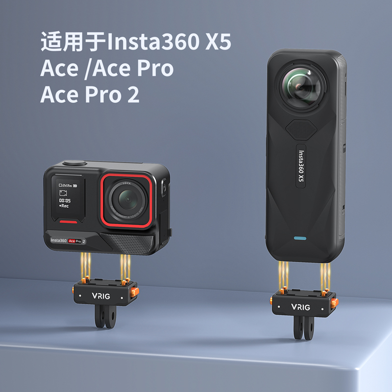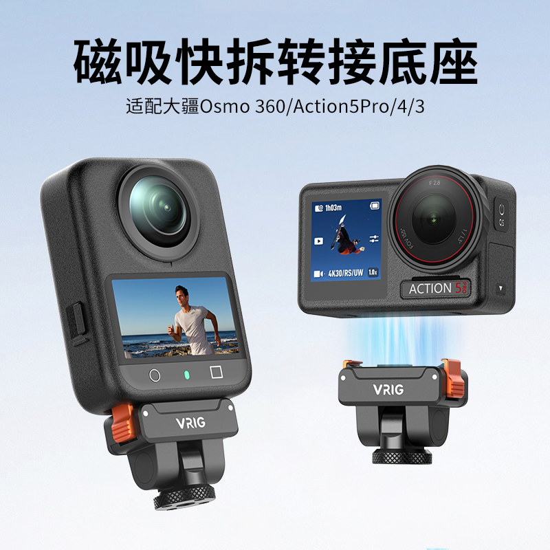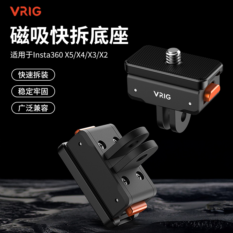 This VRIG Magnetic Quick - Release Base fits Insta360 X5/X4/X3/X2. Made with silicone pads (for anti - slip, shock - absorption), plastic, and metal buckles. Features magnetic quick install/uninstall, stable locking. With 1/4" screw, ACE, DJI action, GoPro interfaces. Enables multi - scenario use (tripod, selfie, riding, car). Lightweight, durable, boosts shooting flexibility.